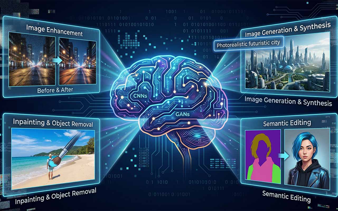 Zentrale Grundlage der KI-basierten Bildbearbeitung sind neuronale Netze, insbesondere sogenannte Convolutional Neural Networks (CNNs) und generative Modelle wie Generative Adversarial Networks (GANs) oder Diffusionsmodelle.